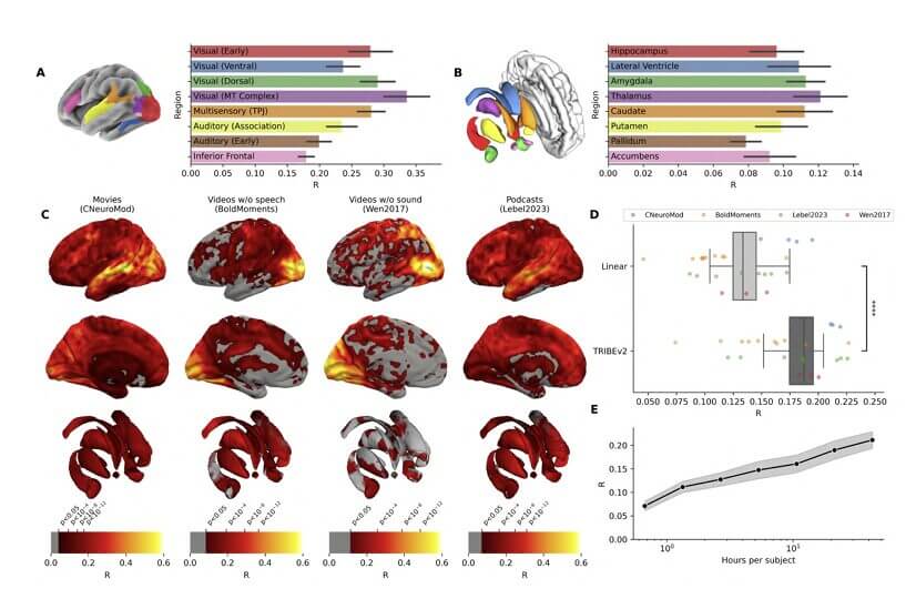 tra i partecipanti di tutti gli studi. C. Punteggi di codifica mediati per soggetto nelle regioni corticali e subcorticali per le quattro condizioni nel set di dati di addestramento. D. Punteggi medi di codifica dei singoli soggetti (punti) per TRIBE v2 e una linea di base lineare classica. E. Leggi di scala della codifica cerebrale. Punteggio di codifica medio di TRIBE v2 sul set di dati Algonauts, all’aumentare del numero di ore di dati di addestramento utilizzati per partecipante. La barra di errore indica la SEM tra i soggetti.