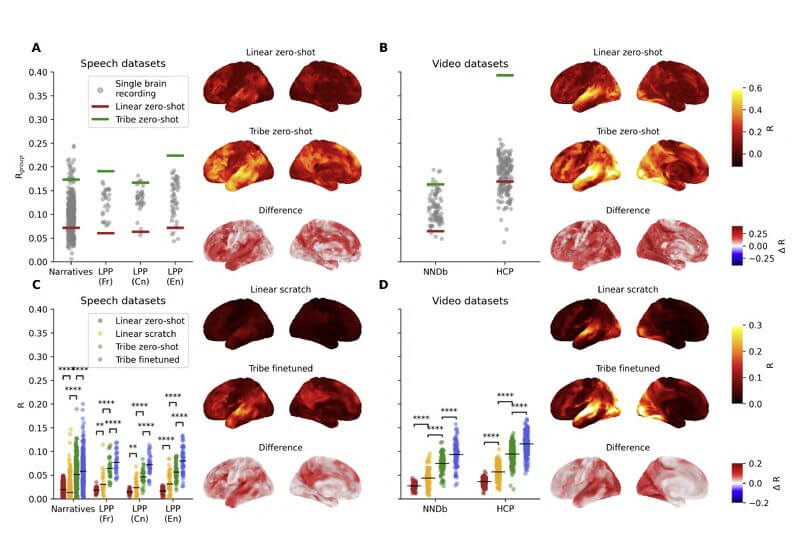 Il paper lo dimostra su un test particolarmente significativo: Tribe v2 è stato testato su paradigmi sperimentali classici della neuroscienza, esperimenti che hanno richiesto decenni di lavoro empirico per essere stabiliti, e ha replicato i risultati autonomamente, senza che nessuno gli avesse fornito quei dati. Il modello, avendo imparato la logica di fondo del funzionamento cerebrale, “ritrova” da solo risultati che la comunità scientifica ha costruito in sessant’anni di ricerca.