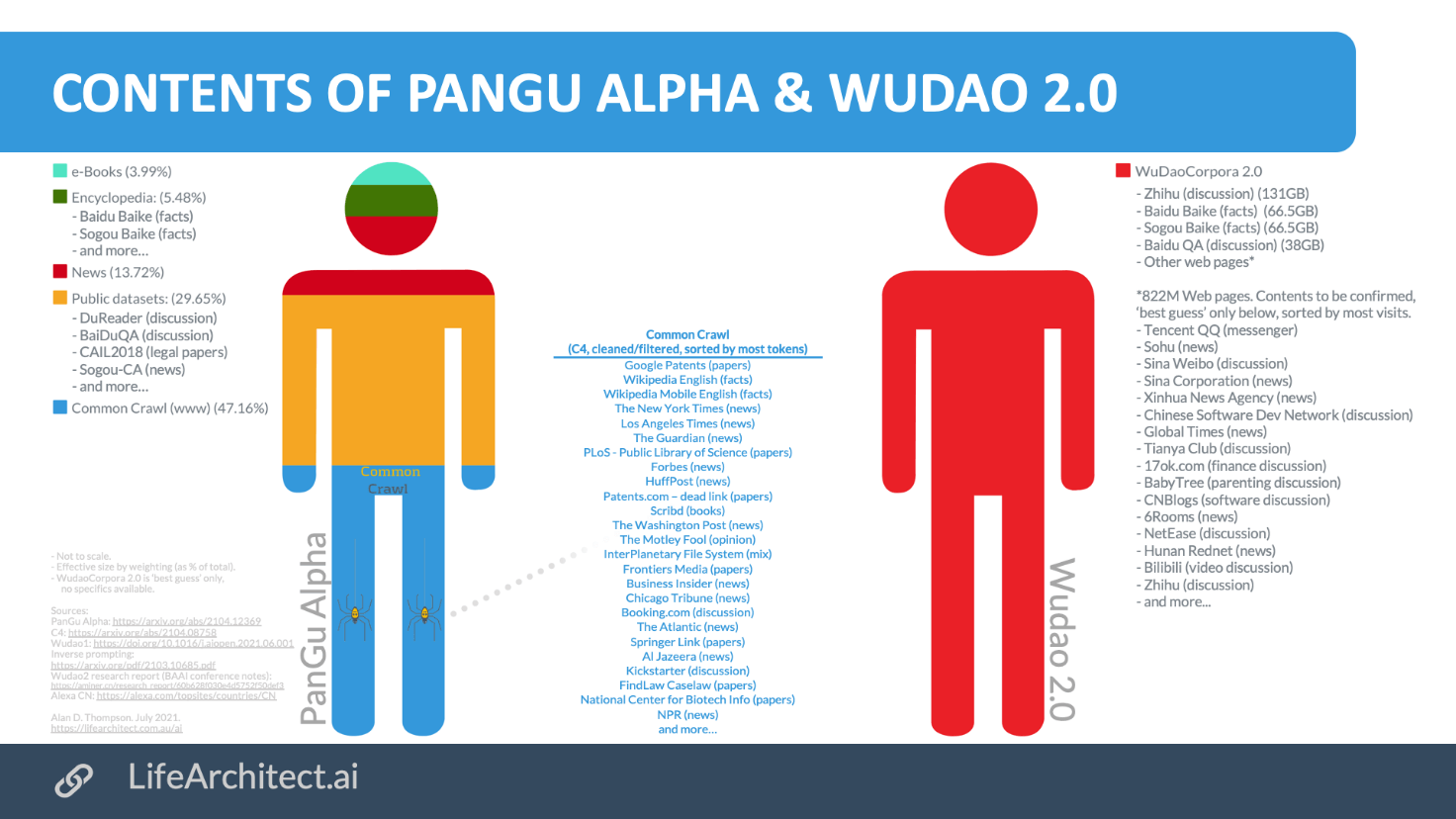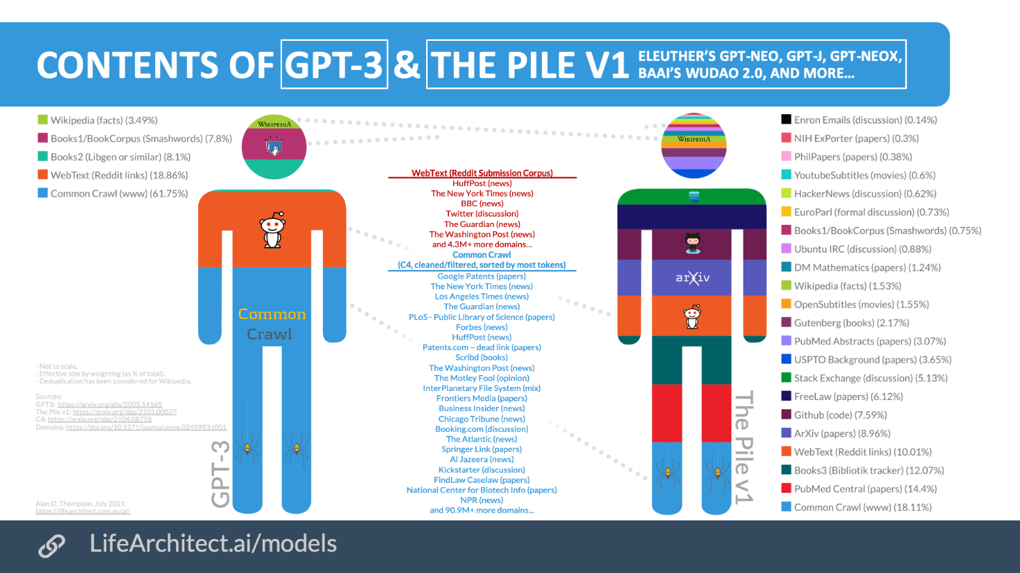 Il nostro modello è stato addestrato… su token 300B tratti da risorse pubblicamente disponibili, tentando, in parte, di replicare la struttura dei dati di addestramento come riportato in Brown et al. (2020) [il set di dati GPT-3, che è dettagliato nella visualizzazione sopra a LifeArchitect.ai/models].— Il documento Jurassic-1 di AI21