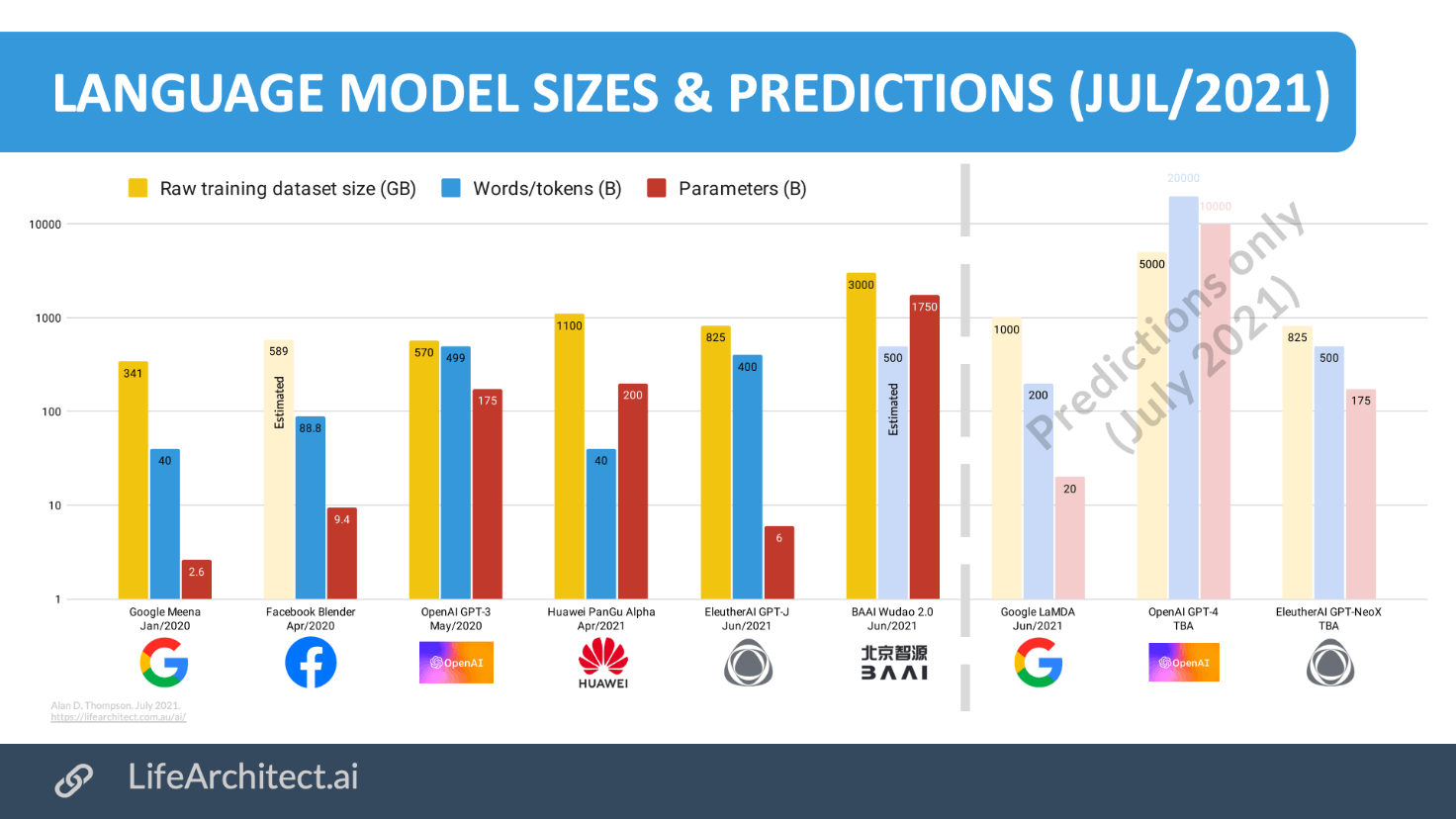 “Oltre 300 applicazioni utilizzano ora GPT-3 e decine di migliaia di sviluppatori in tutto il mondo stanno costruendo sulla nostra piattaforma. Attualmente generiamo una media di 4,5 miliardi di parole al giorno e continuiamo a scalare il traffico di produzione”. (Blog OpenAI, marzo 2021) . Utilizzando una media di 55mila parole per libro = 81.818 libri al giorno. “Nel 2017, c’erano 9.045 biblioteche pubbliche negli Stati Uniti con un totale di 715 milioni di libri e volumi seriali” (statistiche statunitensi) = 79.049 libri per biblioteca.)