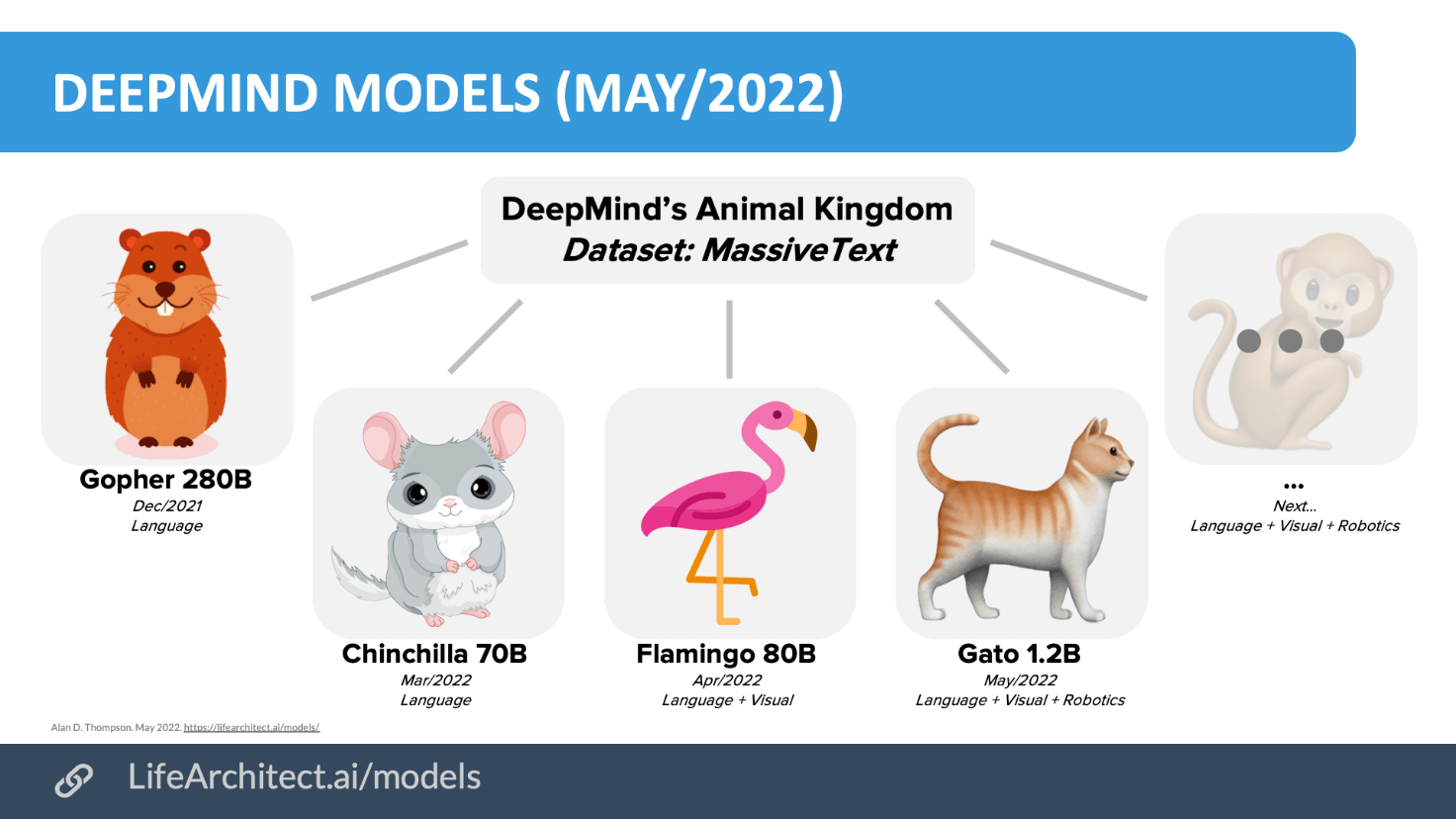 I modelli di DeepMind sono: Gopher, Chinchilla, Flamingo e Gato.