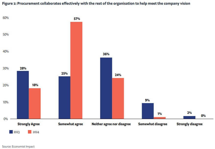 Come accennato, il Procurement Confidence Barometer evidenzia una percezione migliorata della funzione acquisti all’interno dell’organizzazione. Sebbene siano stati compiuti progressi nelle interazioni con gli stakeholder, i CPO hanno ancora spazio per migliorare le loro capacità di collaborazione e integrazione nel tessuto organizzativo. Tuttavia, nel 2024, è aumentata al 75% (rispetto al 53% dell’anno precedente) la percentuale di dirigenti che ritengono che la funzione Procurement collabori efficacemente con l’azienda su questioni strategiche.