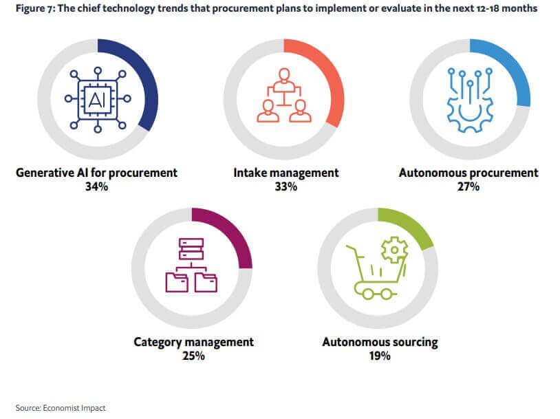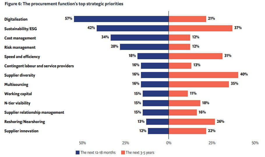 Sebbene la completa digitalizzazione delle operazioni di approvvigionamento sia da anni in cima alle agende dei responsabili, rimane ancora oggi una sfida continua, con il 57% del campione che la considera una priorità per i prossimi 12-18 mesi. Di certo l’adoption di tecnologie emergenti come l’Intelligenza Artificiale e gli algoritmi di Machine Learning stanno contribuendo a identificare con maggiore accuratezza e rapidità i rischi da evitare, creando dei piani accurati di Risk Mitigation, e le opportunità da sfruttare.