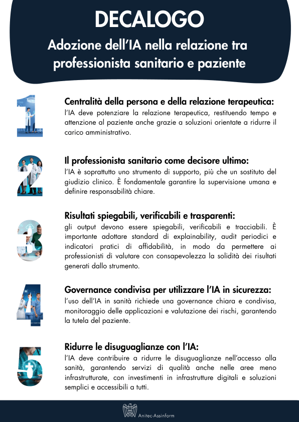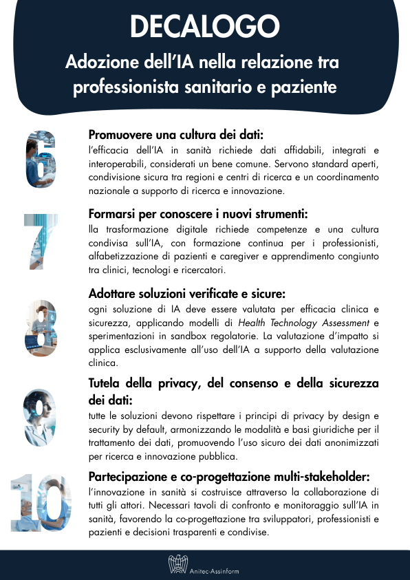 Accanto alle Linee, è stato presentato il Decalogo per l’adozione dell’IA nella relazione tra professionista e paziente. I dieci principi sintetizzano la visione del gruppo di lavoro: centralità della relazione terapeutica, trasparenza, sicurezza, ruolo del professionista come decisore ultimo, interoperabilità, co-progettazione multi-stakeholder, tutela della privacy e valutazione d’impatto.