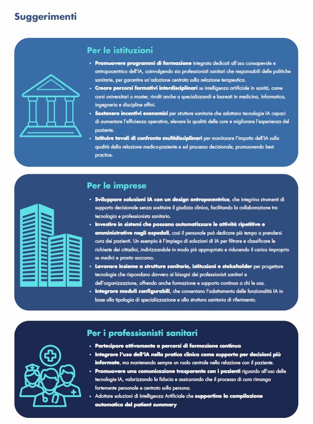 Per le istituzioni, è suggerito promuovere campagne di comunicazione pubblica e sviluppare algoritmi con spiegazioni integrate che rendano facile comprendere le raccomandazioni cliniche.