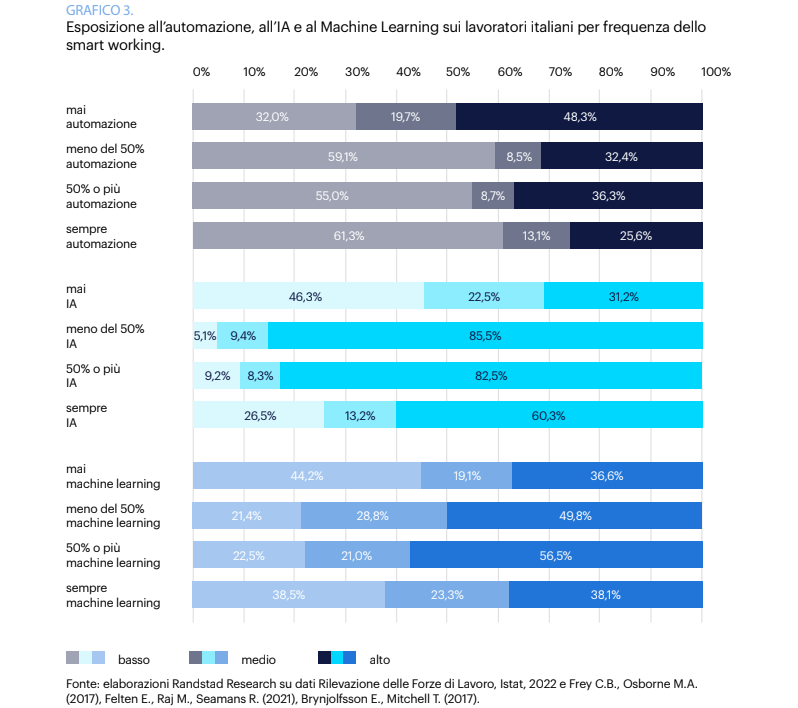 Un altro dato emerso dallo studio riguarda la correlazione tra AI e lavoro da remoto. A differenza di quanto si possa immaginare, i lavoratori meno soggetti all’automazione sono quelli che non fanno mai smartworking (48,3% di esposizione). Chi lavora da casa almeno metà del tempo raggiunge invece un’esposizione dell’82,5%, mentre per chi lo fa solo occasionalmente il valore sale all’85,5%.