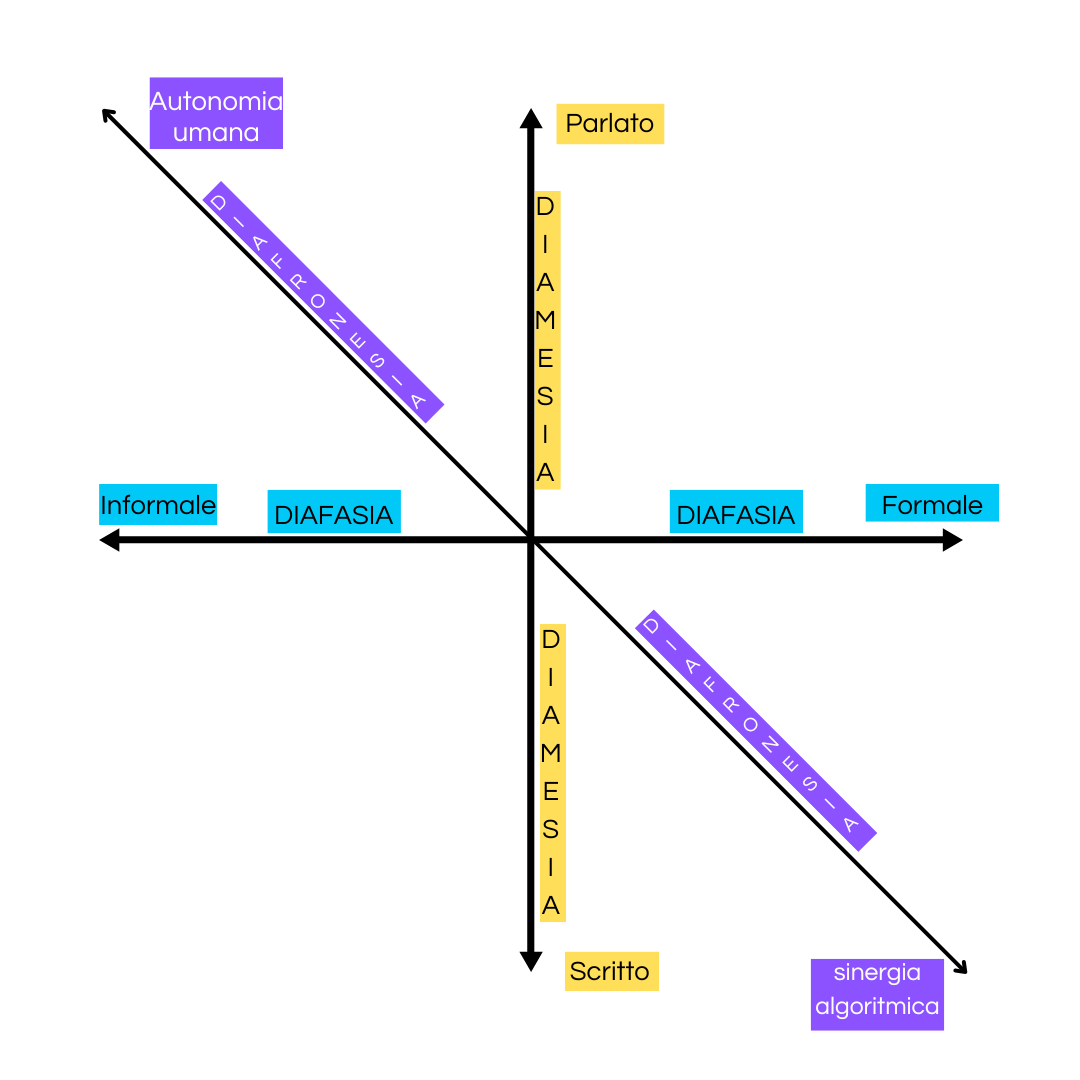 Si potrebbe quindi pensare a una nuova variabile sociolinguistica, chiamata diafronesi, un termine che nasce dall’unione di διά, «attraverso» + φρόνησις, «intelligenza, saggezza pratica» che combina l’idea dell’attraversamento con il concetto di intelligenza applicata. È importante considerare che il termine phronèsis, distinto da nous (intelletto puro), indica una forma di saggezza pratica, particolarmente pertinente per descrivere l’interazione tra uomo e AI, dove il linguaggio è modellato da processi di apprendimento automatizzato.