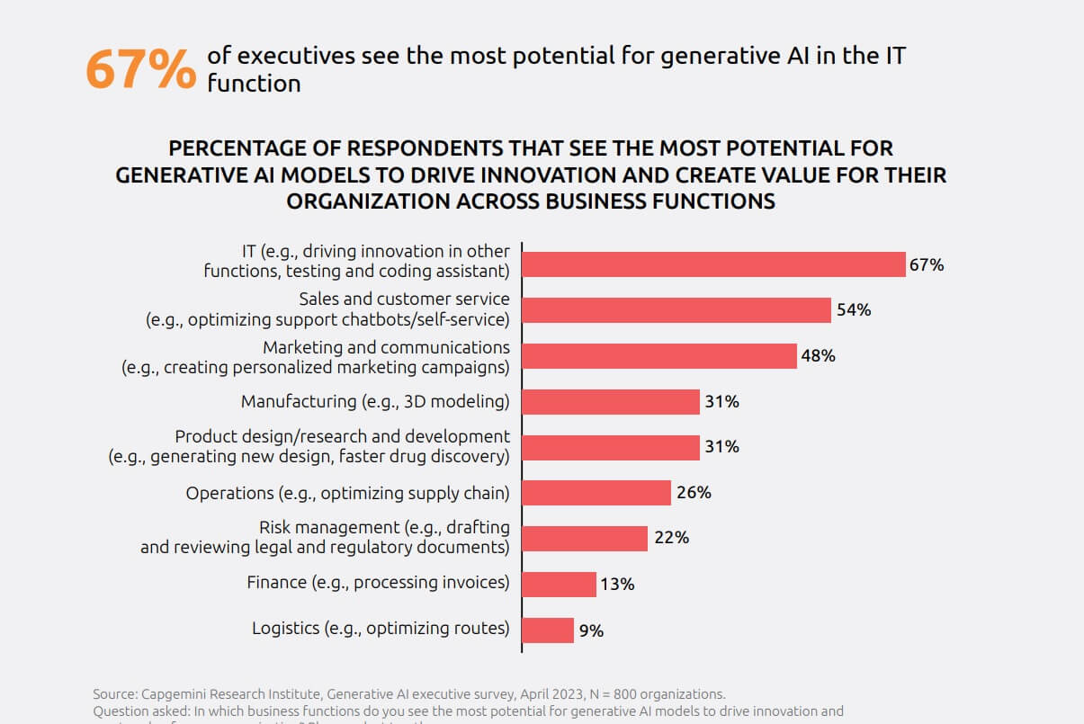 Nonostante i potenziali rischi, in particolare in termini di violazione del copyright e cybersecurity, il 74% dei dirigenti ritiene che i vantaggi offerti dall’AI generativa siano superiori alle preoccupazioni ad essa associate. Le aziende ritengono che le piattaforme o gli strumenti basati sull’AI generativa più rilevanti per il proprio settore siano i chatbot per automatizzare il customer service e migliorare i processi di knowledge management, così come la progettazione, raccolta e sintesi dei dati.