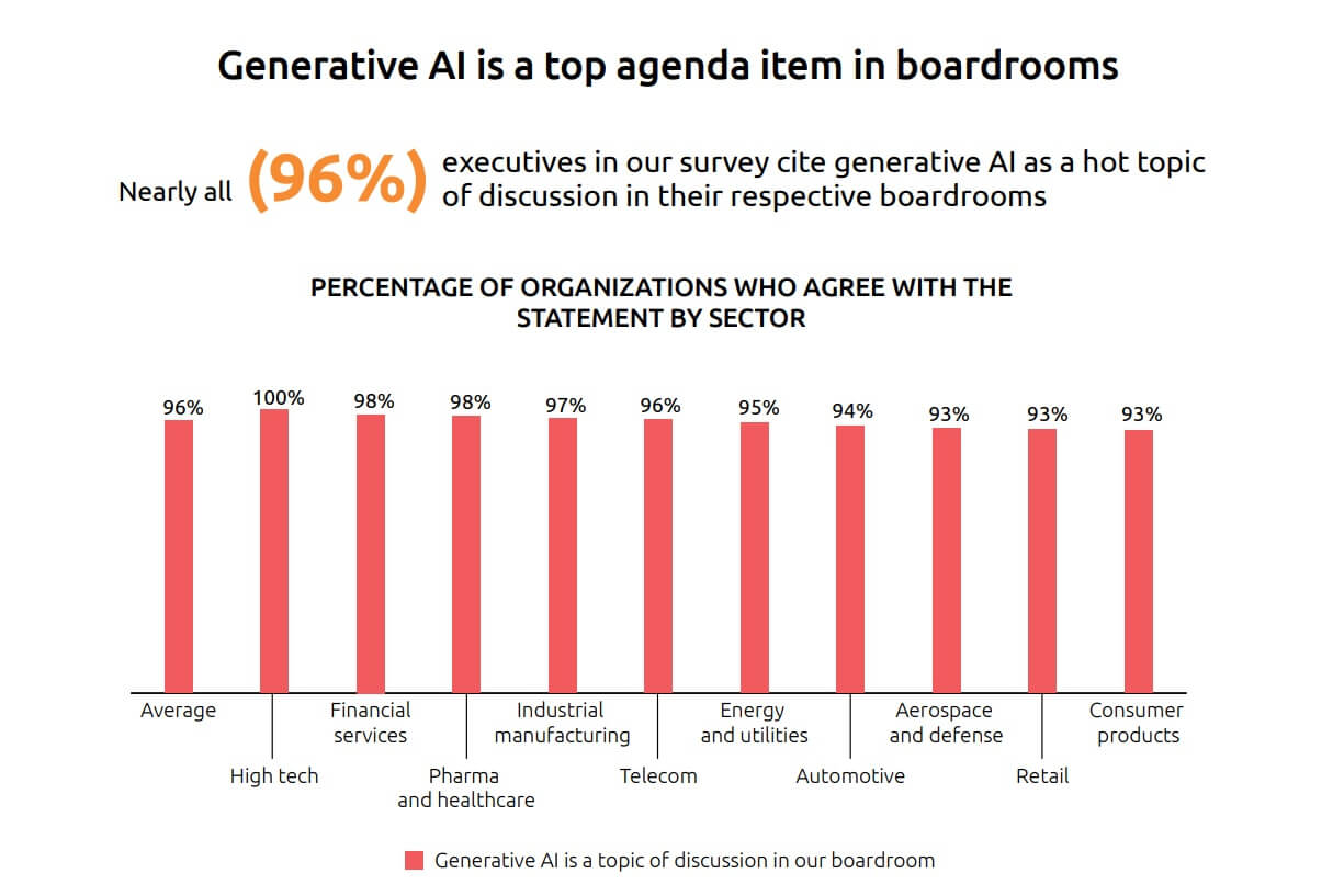 Secondo l’ultimo report del Capgemini Research Institute, intitolato “Harnessing the value of generative AI: Top use cases across industries”, l’AI generativa sta guadagnando una posizione di rilievo nelle agende dei consigli di amministrazione. Il 96% dei dirigenti considera l’AI generativa un tema di grande importanza, e la leadership aziendale sembra credere fermamente in questa tecnologia. Gli strumenti di AI generativa più rilevanti, secondo le organizzazioni, sono quelli legati a chatbot, design di prodotti e servizi e customer experience.
