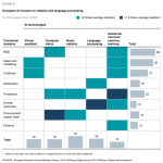 I dati disponibili sulla diffusione sono scarsi, ma i sondaggi dimostrano che le aziende europee restano indietro rispetto alle loro controparti statunitensi nell’adozione di soluzioni basate su big data e advanced machine learning che costituiscono le basi dell’AI – con il 12% in meno di utilizzo rispetto agli Stati Uniti. Invece, il divario tra Europa e USA riguardante l’uso di strumenti di AI quali smart workflows, cognitive agents e language processing è pari al 16%.