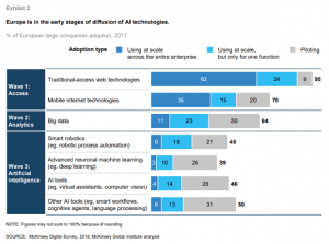 È questa la previsione del nuovo report pubblicato dal McKinsey Global Institute (MGI) e intitolato “Notes from the AI frontier: Tackling Europe’s gap in digital and AI”. I risultati di questo studio derivano dalla combinazione di autorevoli fonti di ricerca secondarie con tre sondaggi globali indipendenti a livello corporate e settoriale condotti nel 2017 e nel 2018 per valutare al meglio come le imprese anticipano il modo in cui l’AI potrebbe evolvere in Europa. La ricerca aggiorna anche il modello globale completo sulla diffusione dell’intelligenza artificiale di MGI, in particolare integrando una prospettiva sullo sviluppo degli ecosistemi di avvio di intelligenza artificiale in Europa.