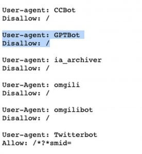 Uno snippet del robots.txt del NYT che mostra che l’azienda ha disabilitato GPTBot