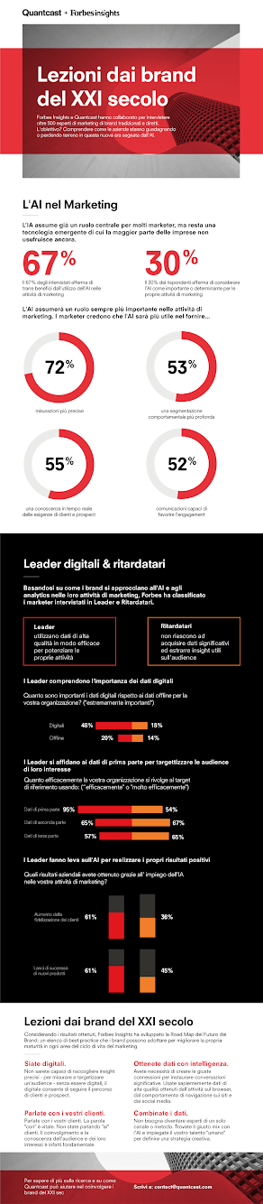 L’analisi del panel ha permesso a Quantcast e Forbes Insights di sviluppare un vero e proprio indice di maturità dei brand (il Punteggio per la Maturità dei brand del XXI secolo) grazie al quale è possibile identificare e comprendere le caratteristiche dei brand “leader” e che cosa li fa emergere rispetto ai “ritardatari”. Interessante notare come, rispetto ai benefici ottenuti dai “leader” che hanno già fatto investimenti in AI, la crescita del fatturato si attesti sul 15% circa, più del doppio rispetto ai brand che sono in ritardo.