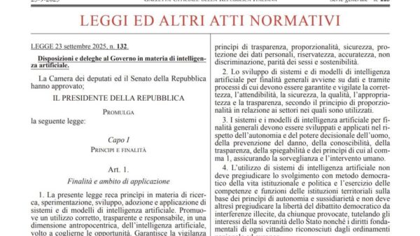 Tra principi, deleghe e regole settoriali, la Legge pubblicata in G.U. il 25 settembre, introduce un quadro nazionale sull’intelligenza artificiale che si affianca all’AI Act europeo. Il provvedimento punta a orientare l’uso responsabile dell’AI. Restano però nodi aperti: costi impliciti, sovrapposizioni normative e una governance multi-Authority ancora tutta da armonizzare | | | |