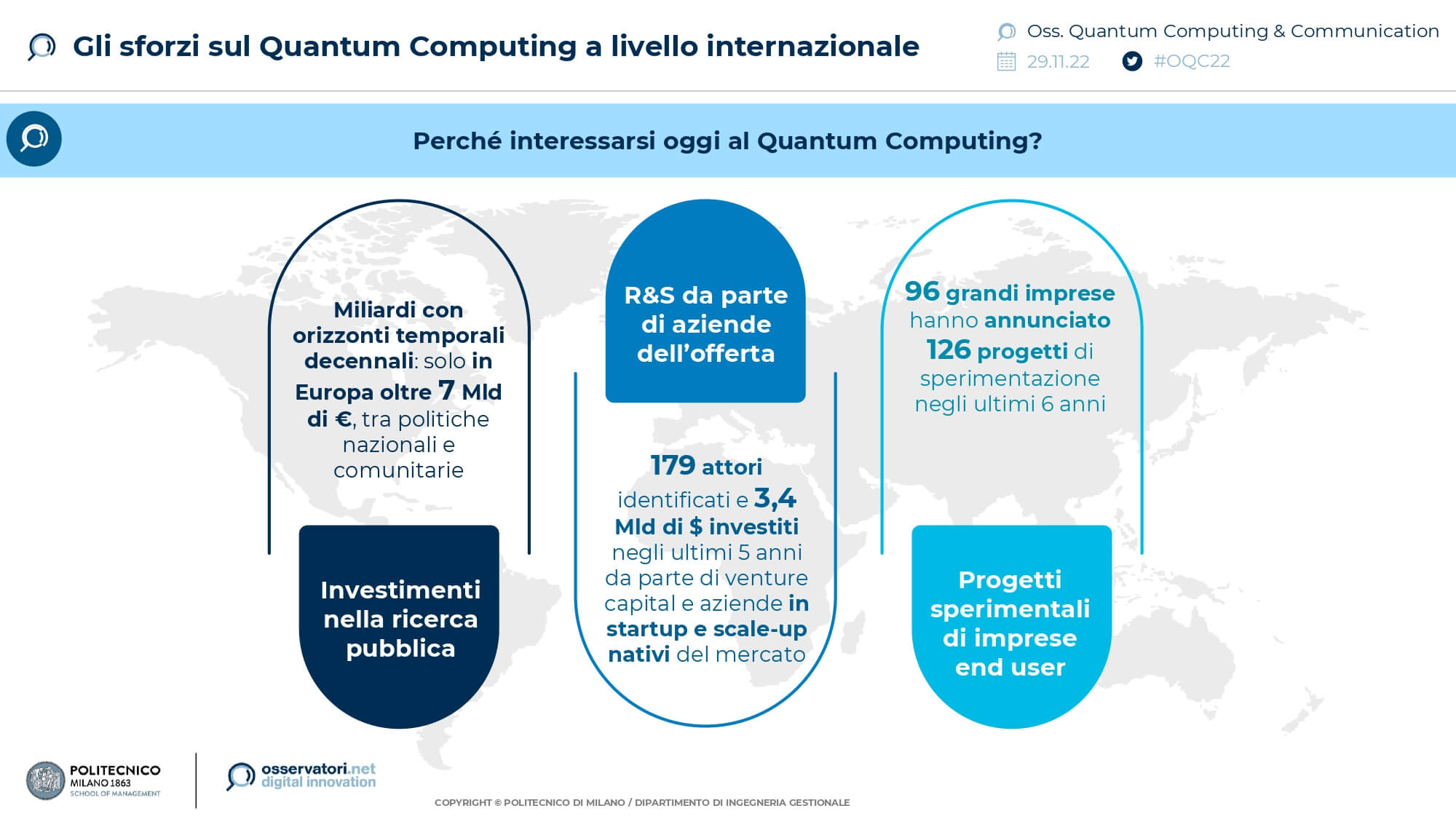 “Il Quantum Computing è una tecnologia potenzialmente dirompente, il cui impatto sociale e scientifico è paragonabile all’invenzione stessa del calcolatore. I prossimi decenni saranno testimoni di cambiamenti importanti guidati dall’avvento delle tecnologie quantistiche in settori quali intelligenza artificiale, medicina, energia, ambiente, e molti altri ancora. Ci sono però ancora sfide importanti da affrontare perché il Quantum Computing possa passare dal livello prototipale di oggi ad una tecnologia di supercalcolo affidabile” afferma Paolo Cremonesi, Responsabile Scientifico dell’Osservatorio Quantum Computing & Communication edocente del Dipartimento di Elettronica, Informazione e Bioingegneria del Politecnico di Milano.
