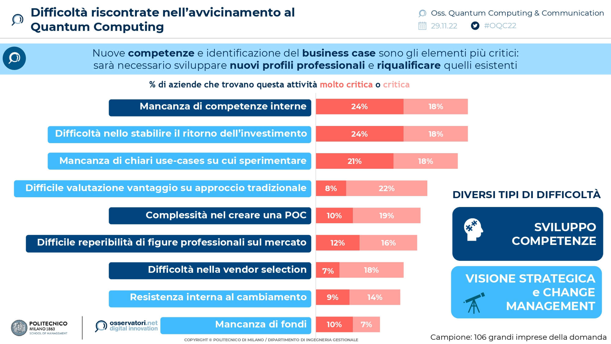 Si tratta di grandi aziende all’avanguardia, caratterizzate da capacità di investimento e cultura sull’innovazione, decise a rendersi precursori della tecnologia nel paese. Nel campione generale, invece, il percorso di avvicinamento al Quantum Computing è ancora embrionale. Le principali difficoltà riscontrate riguardano la mancanza di competenze sul tema e la difficoltà a investire senza un chiaro ritorno nel breve termine.