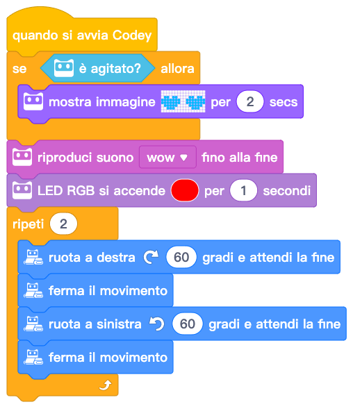 Infine, si è deciso che per alcune emozioni il robot svolgesse movimenti differenti. Ad esempio, per la gioia, il robot ruota a sinistra di 360° e ripete il movimento due volte consecutive; per la rabbia Codey Rocky va indietro, si ferma e poi torna avanti per due volte; infine, per l’amore il robot ruota a destra e poi a sinistra di 60°.
