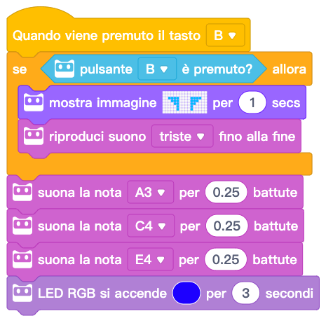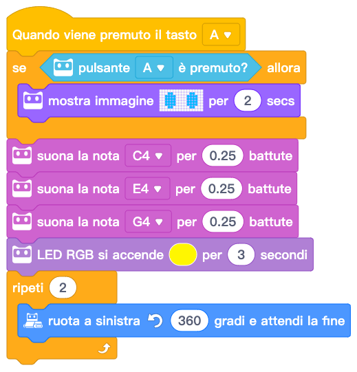 Ai comandi, inoltre, si è aggiunta la scelta di utilizzare delle note musicali capaci di creare una brevissima melodia associata a ciascun stato emotivo. Questa scelta è nata perché la bambina è appassionata di musica e, quindi, sarebbe stato più facile avvicinarla all’attività. Successivamente, si è stabilito che il robot si illuminasse di un colore differente a seconda dell’emozione presentata. Si è scelto di utilizzare il colore giallo per la gioia, il blu per la tristezza, il viola per la rabbia e il rosso per l’amore, in quanto convenzionalmente questi colori vengono attribuiti alle relative emozioni; tali comandi sono stati opportunamente inseriti nell’app di programmazione.