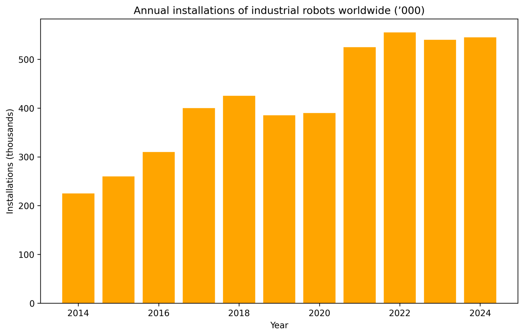 Secondo l’International Federation of Robotics, nel 2024 erano operativi oltre 4,7 milioni di robot industriali. Il numero cresce di oltre 500mila unità all’anno, il doppio rispetto a dieci anni fa.