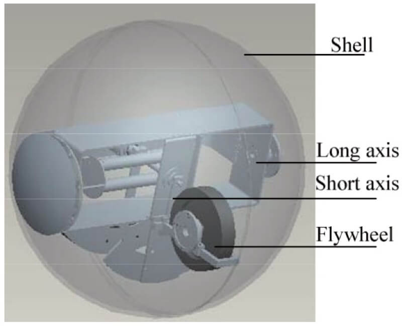 Il centro di controllo, il motore e le batterie sono contenute all’interno del telaio. L’orientamento degli elementi rispetto alla sfera può essere cambiato e la direzione del baricentro si sposta, determinando uno spostamento del robot.