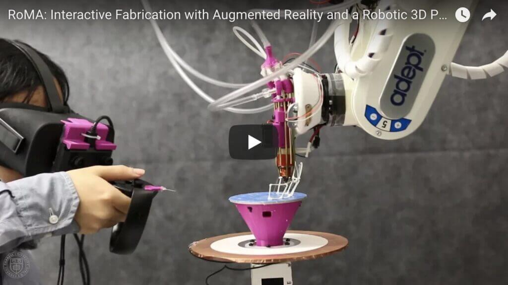 RoMA richiede un po’ di lavoro di squadra per funzionare. Mentre si indossano occhialini AR e si tiene in mano un controller, l’utente disegna funzioni 3D sopra una piattaforma condivisa con il robot. Così non si intralciano a vicenda: l’utente disegna sulla metà anteriore della piattaforma, mentre il robot produce sul retro. Dopo la finalizzazione di una funzione, l’utente gira la piattaforma intorno e il robot inizia la fabbricazione, la stampa 3D.