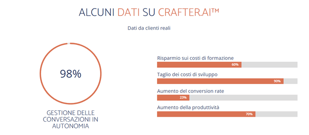 Con CRAFTER.AI™ è possibile realizzare in poco tempo virtual agents che arrivano a gestire oltre il 98% delle conversazioni in autonomia.